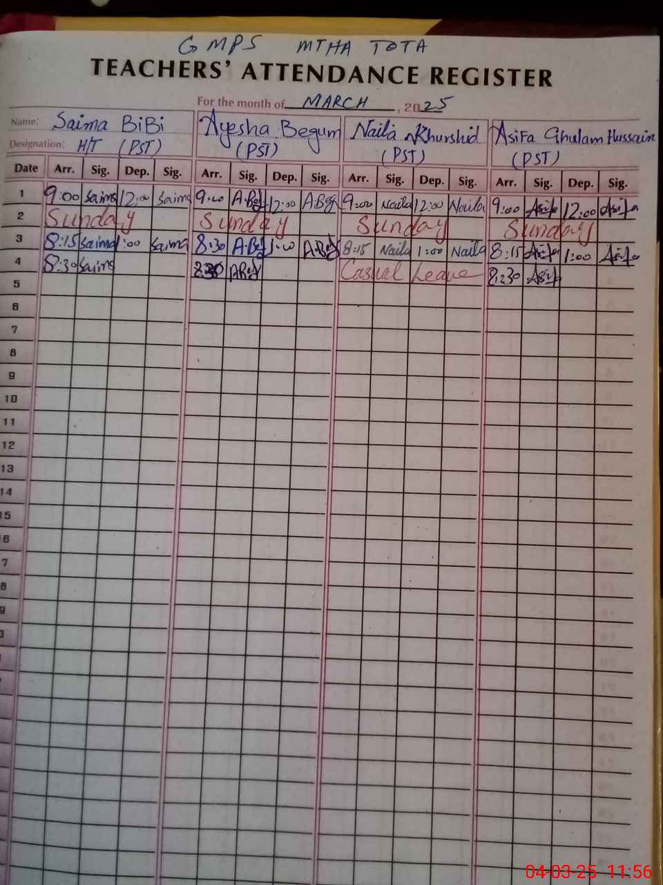 | 36**** | Na**** Kh**** | PST | Regular | 2 | 0 | 0 | 0 | 0 | 0 | 0 | 0 | 2 | Casual |