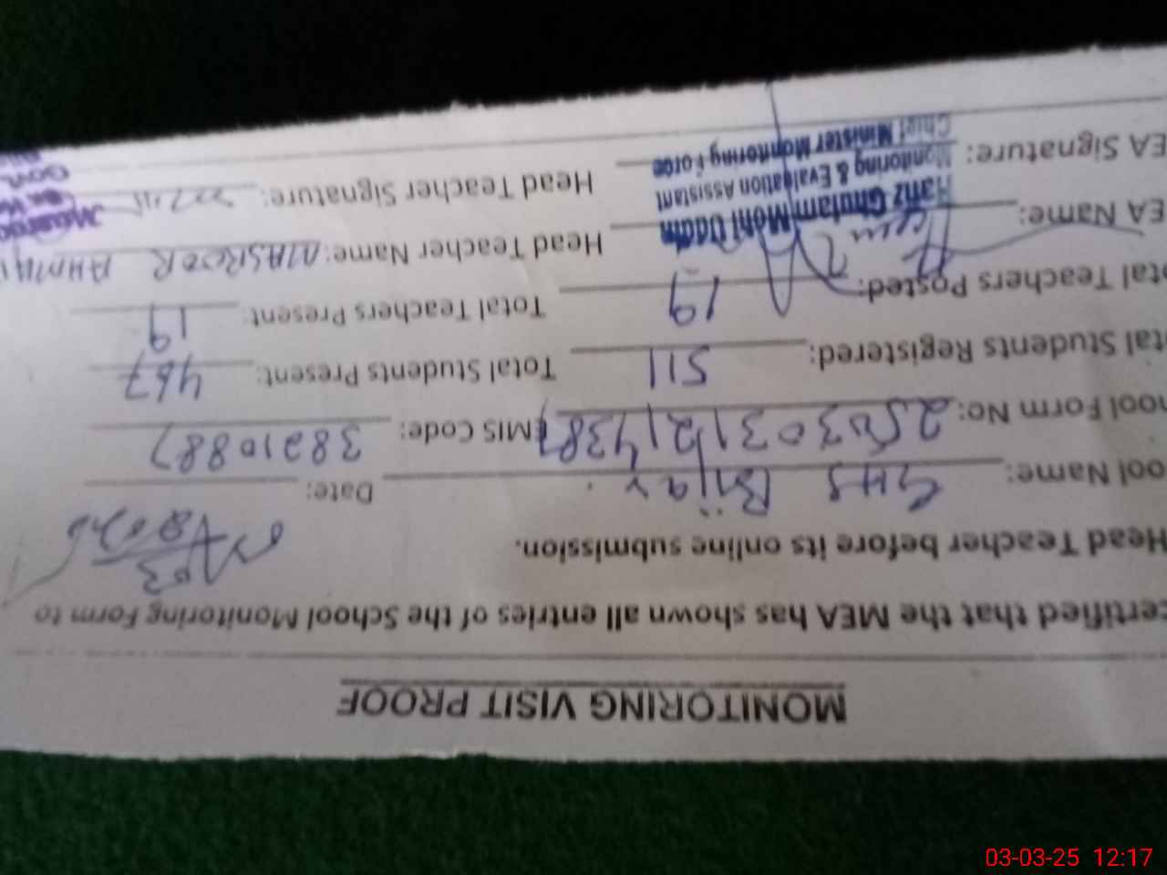 | Attendance Register | Head Teacher | MEA with School | Visit Proof |