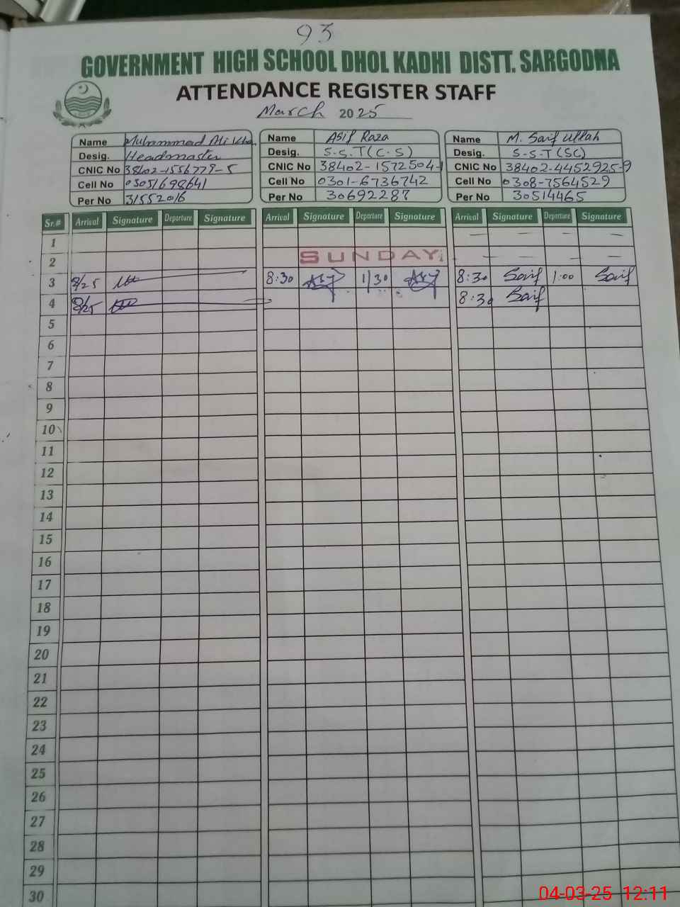 | CNIC | Full Name | Designation | R/C | Absence During Last Calender Month |