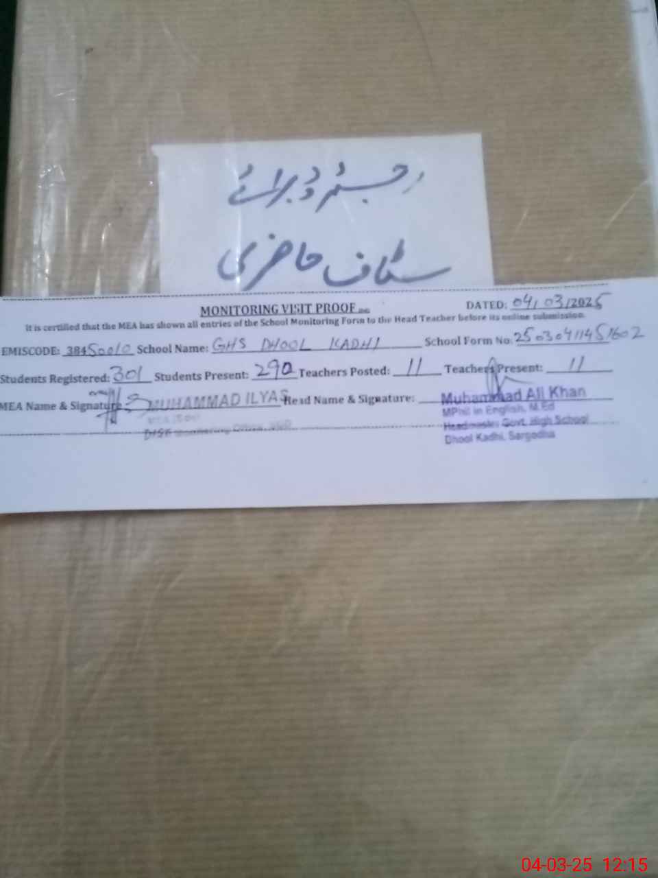 | Name: MU**** AL**** KH**** Designation: (School Headmaster's/Headmistress's) HEADMASTER Phone/Cell Number: 03**** |