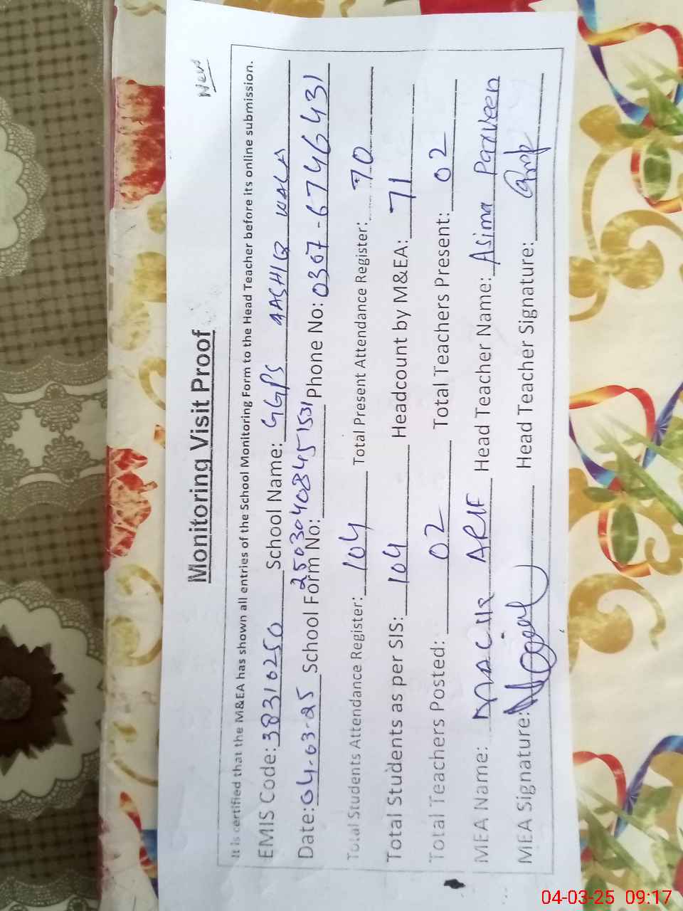 | EMIS Code: 38310250 | Name of School: GGPS ASHIQ WALA | |||