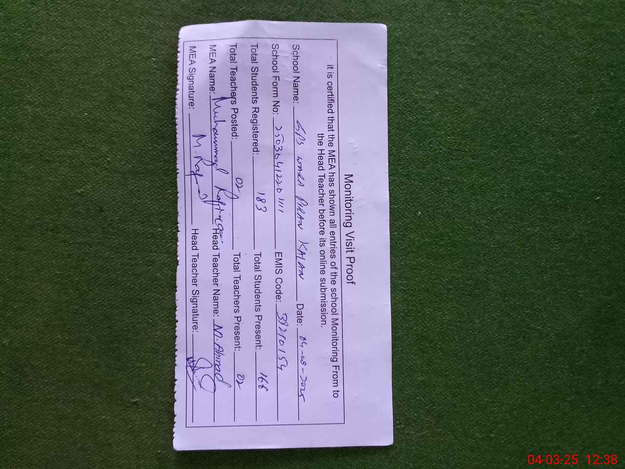 | Attendance Register | Head Teacher | MEA with School | Visit Proof |