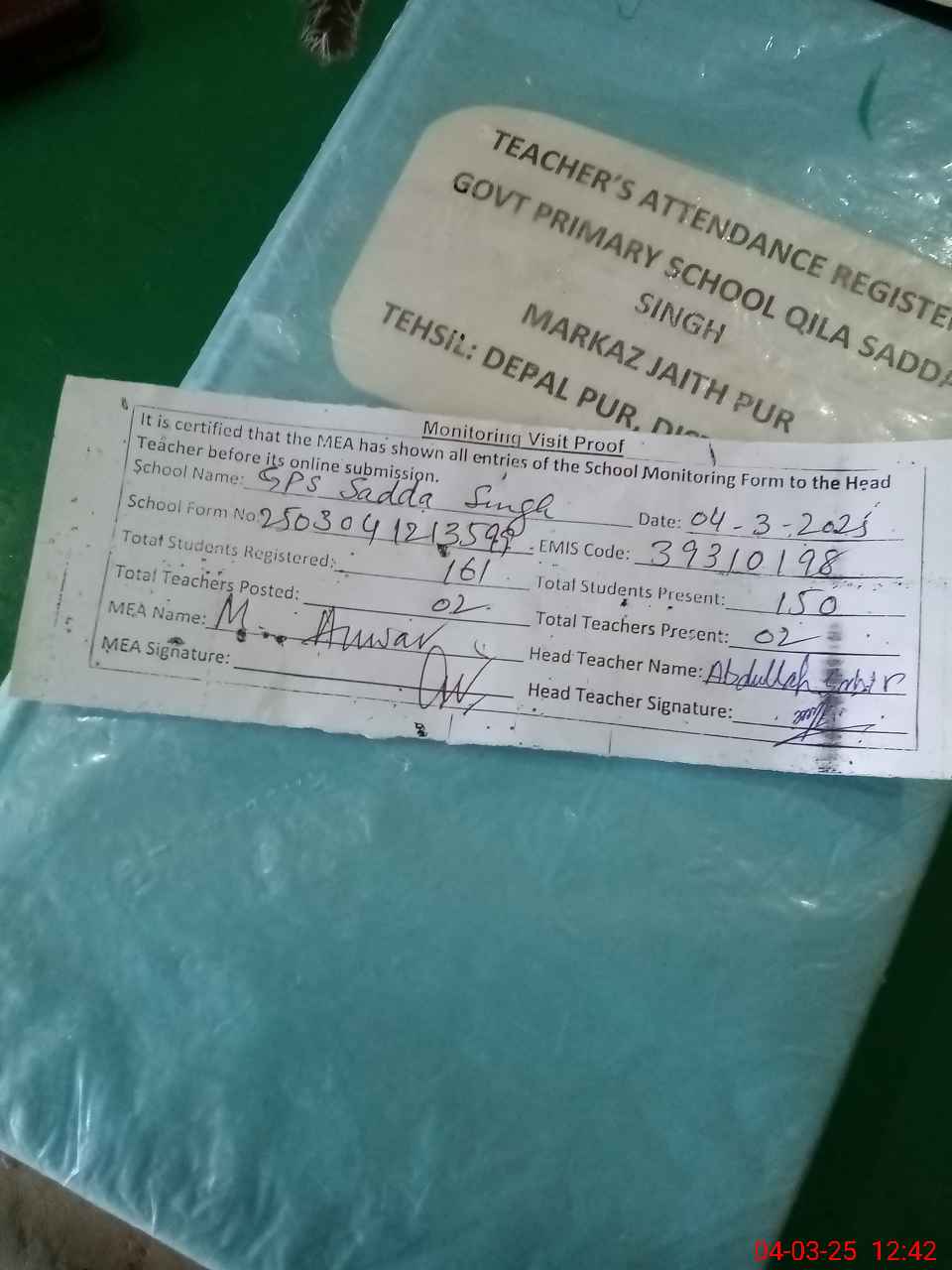 | Attendance Register | Head Teacher | MEA with School | Visit Proof |
