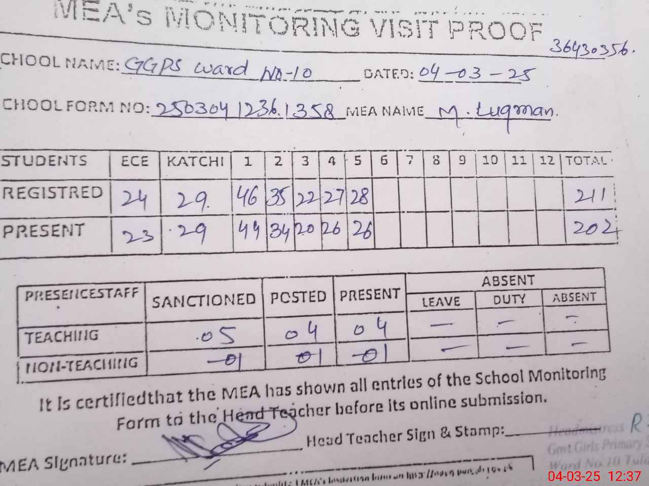 | Attendance Register | Head Teacher | MEA with School | Visit Proof |