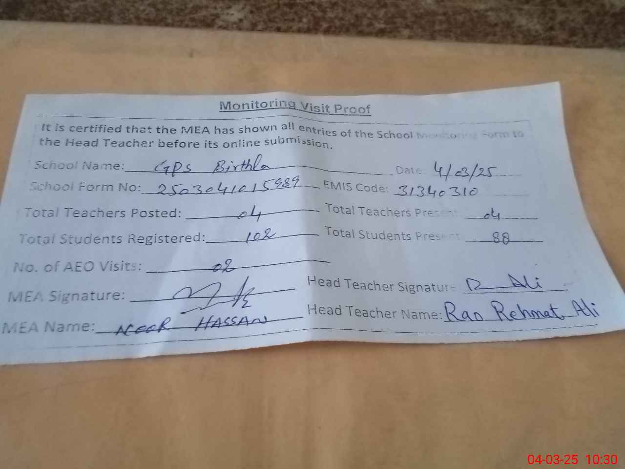 | Attendance Register | Head Teacher | MEA with School | Visit Proof |