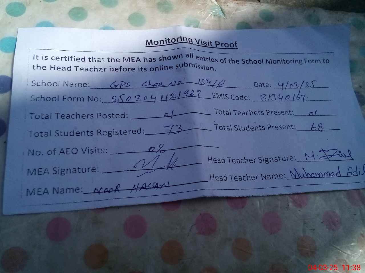 | EMIS Code: 31340167 | Name of School: GPS CHAK NO 154/P | |||