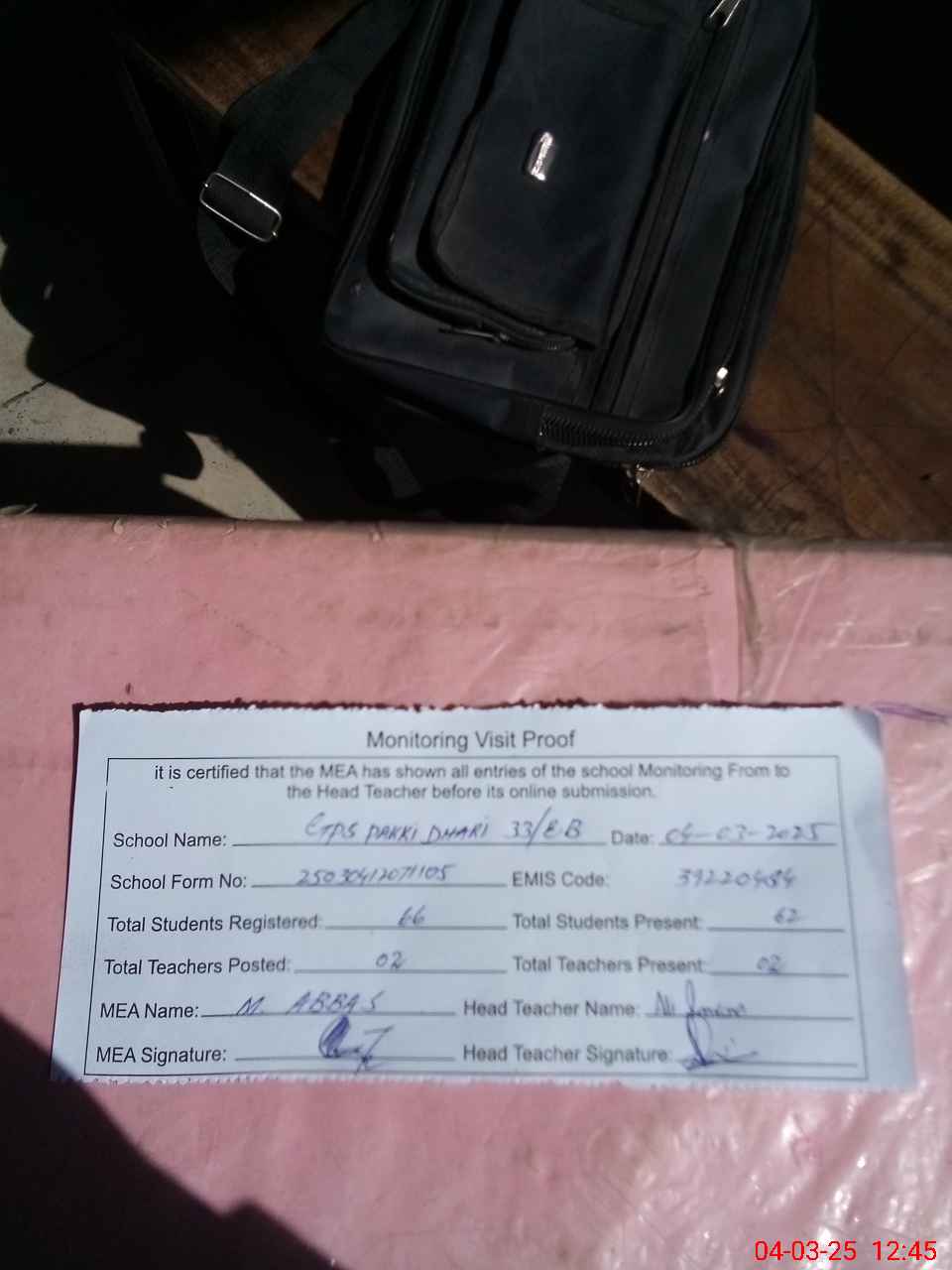 | Attendance Register | Head Teacher | MEA with School | Visit Proof |
