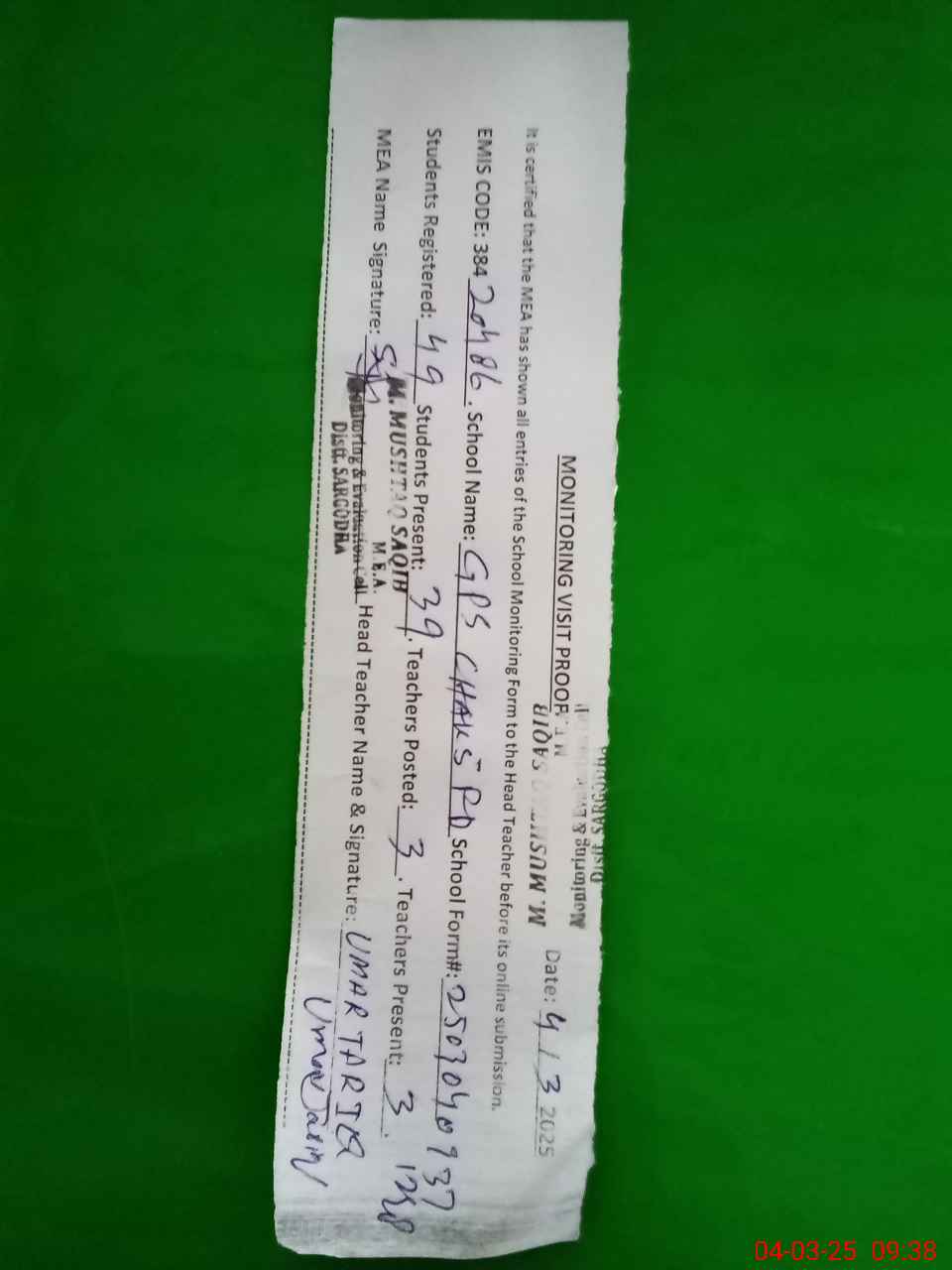 | Name: Um**** Ta**** Designation: (School Headmaster's/Headmistress's) PST Phone/Cell Number: 03**** |
