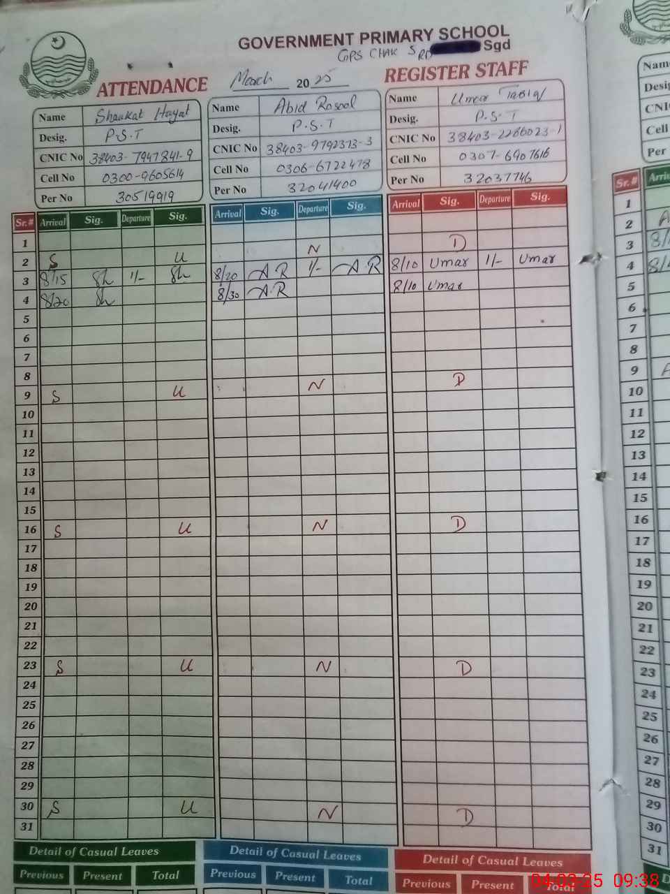 | CNIC | Full Name | Designation | R/C | Absence during last cal. month |
