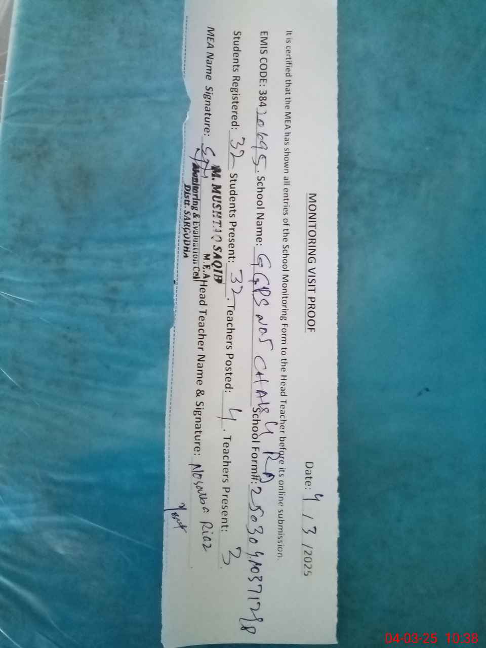 | Attendance Register | Head Teacher | MEA with School | Visit Proof |