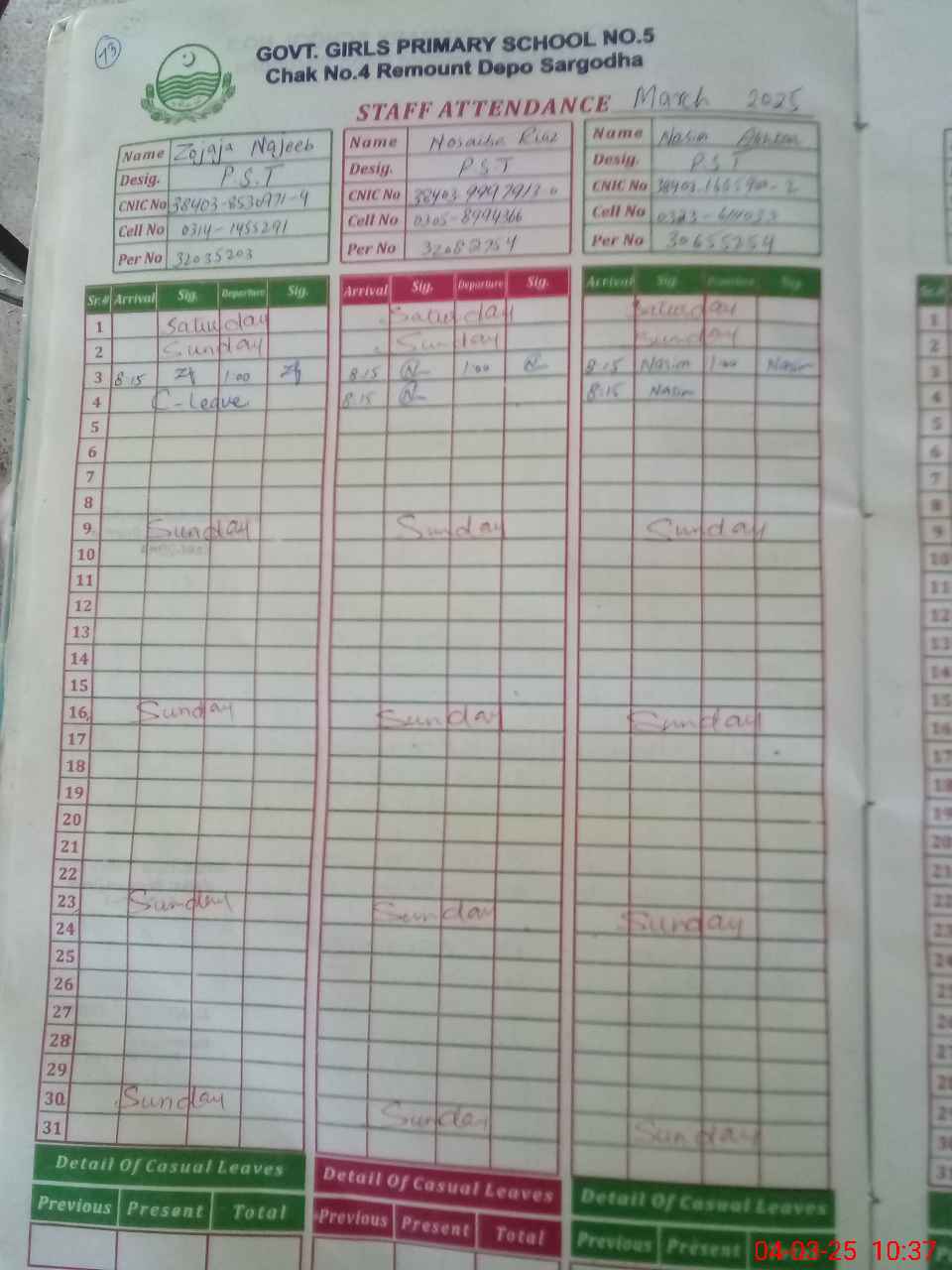 | CNIC | Full Name | Designation | R/C | Absence During Last Calender Month |