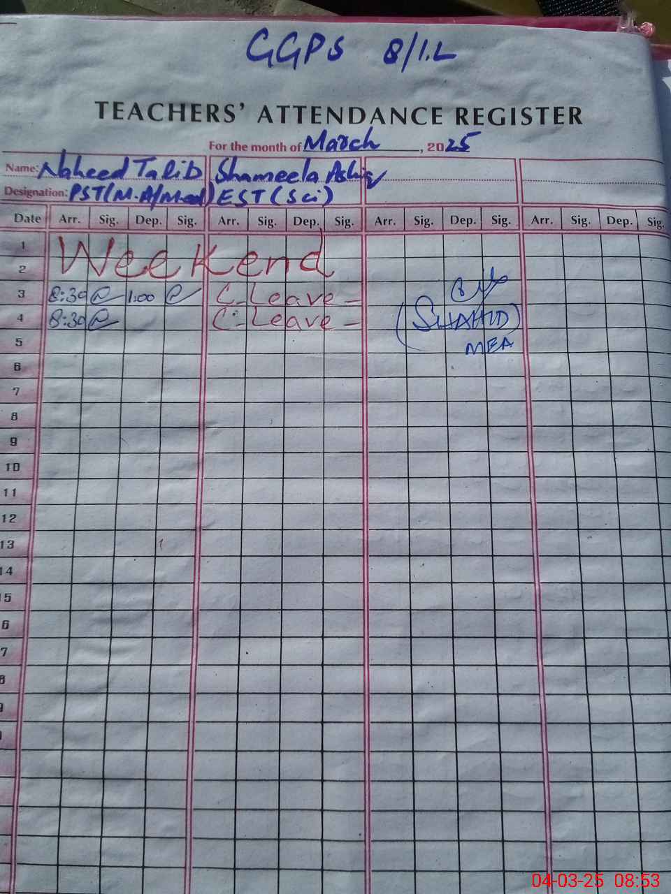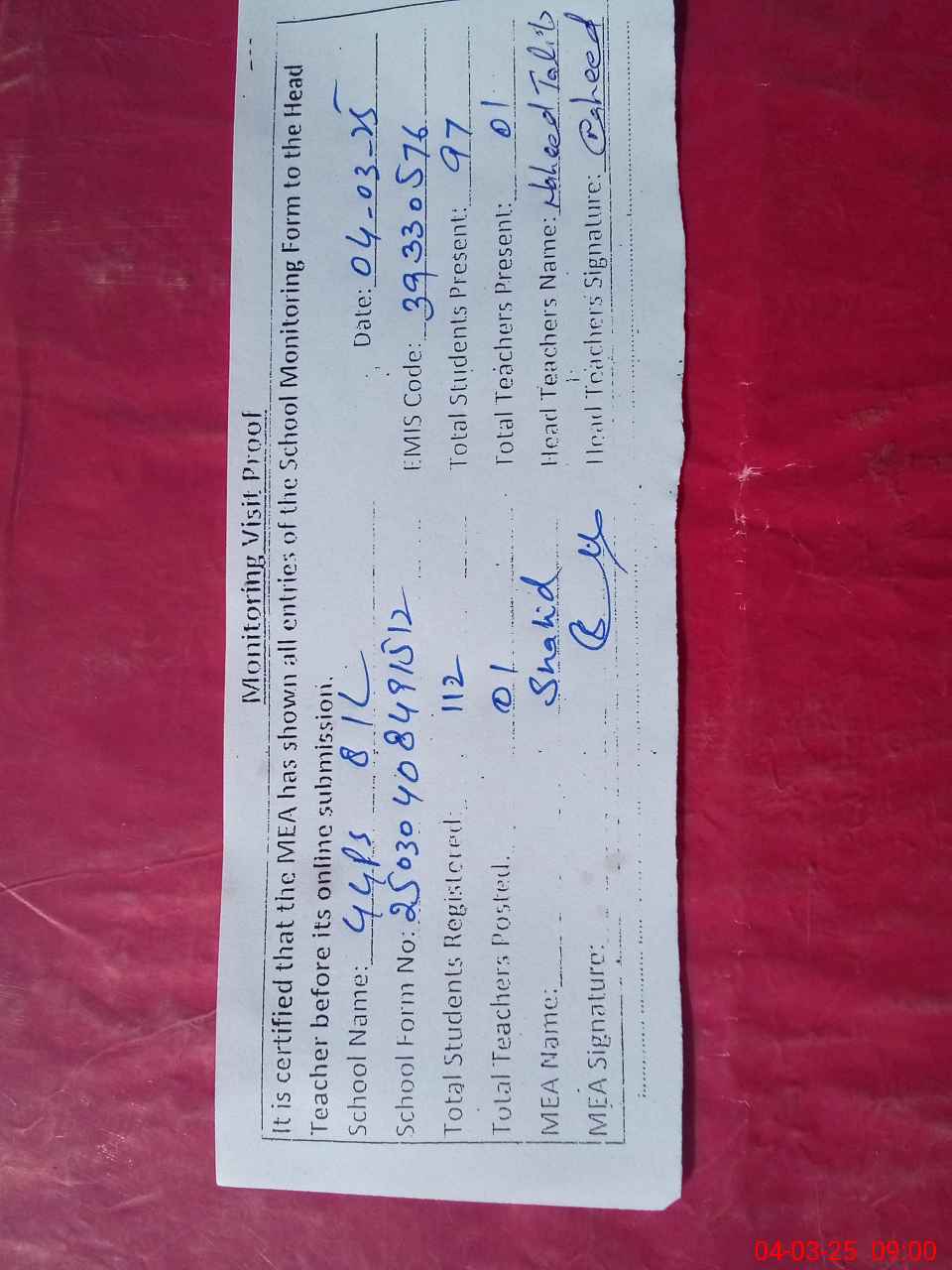 | Attendance Register | Head Teacher | MEA with School | Visit Proof |