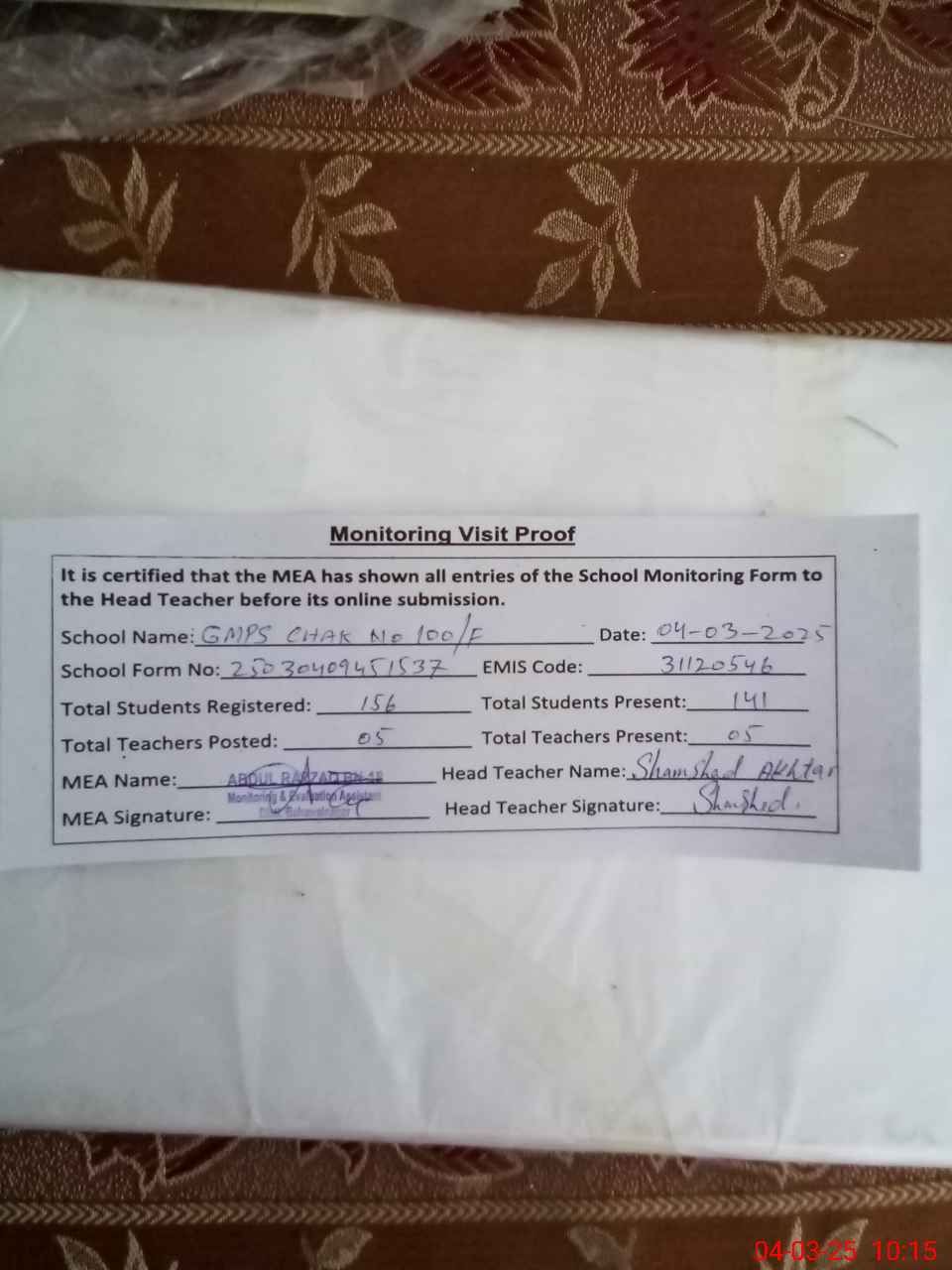 | Attendance Register | Head Teacher | MEA with School | Visit Proof |