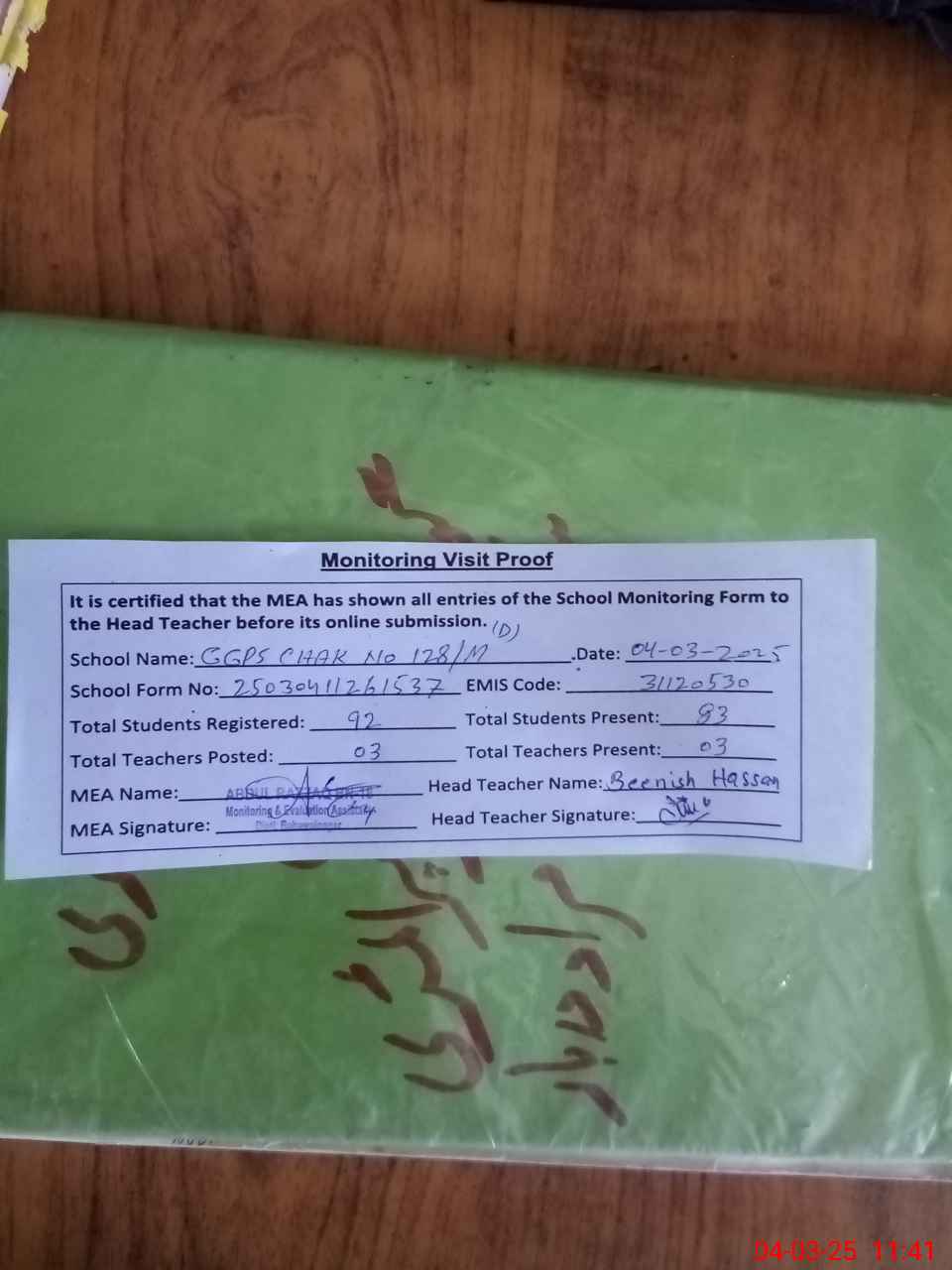 | EMIS Code: 31120530 | Name of School: GGPS CHAK NO. 128/M DARBAR | |||