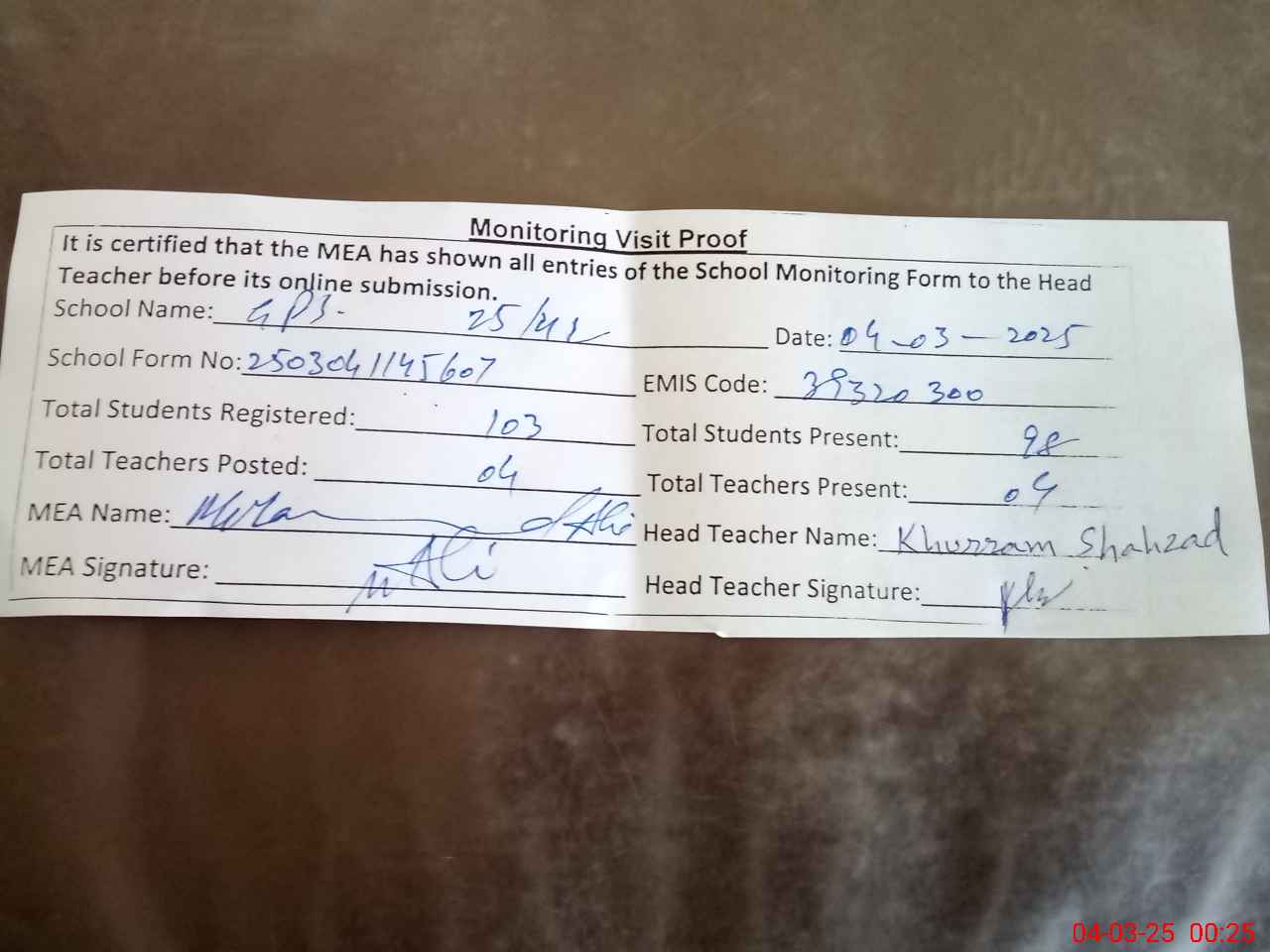 | Attendance Register | Head Teacher | MEA with School | Visit Proof |