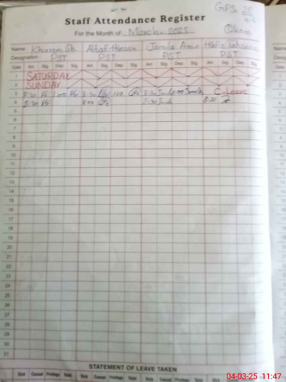 | Leave | Duty | Absent | Maternity | Medical | Ex- Pak |