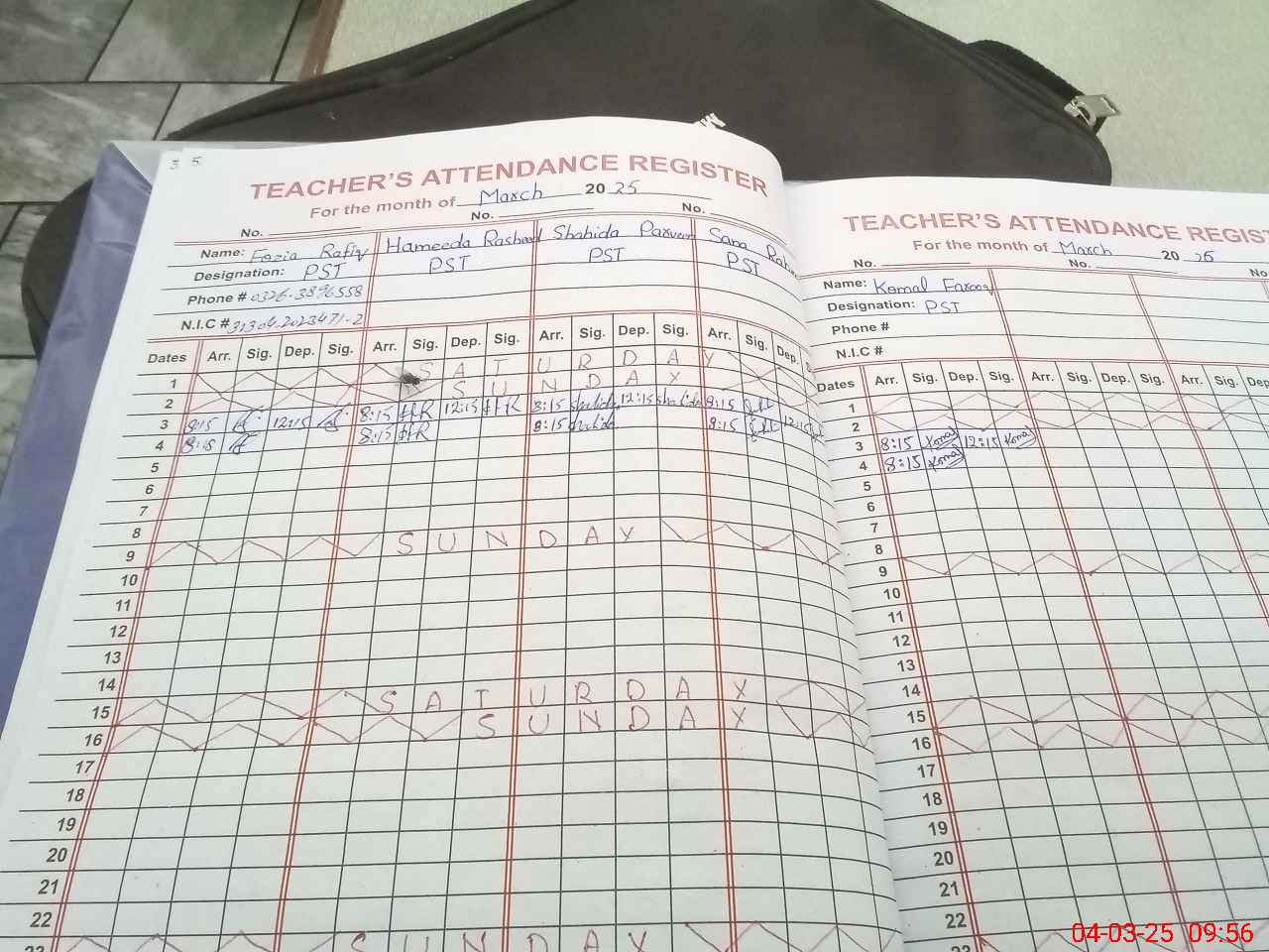 | CNIC | Full Name | Designation | R/C | Absence During Last Calender Month |