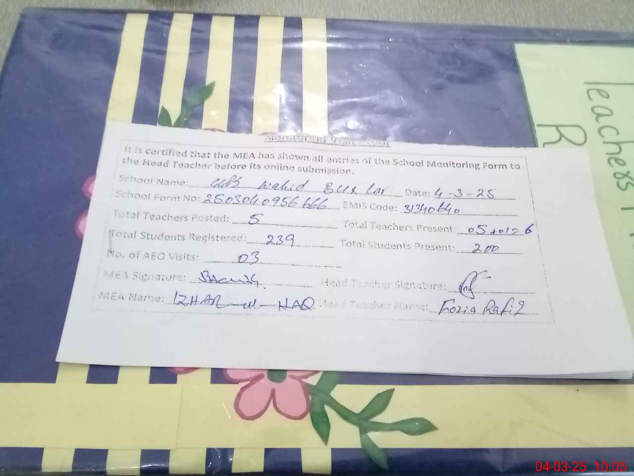 | Attendance Register | Head Teacher | MEA with School | Visit Proof |