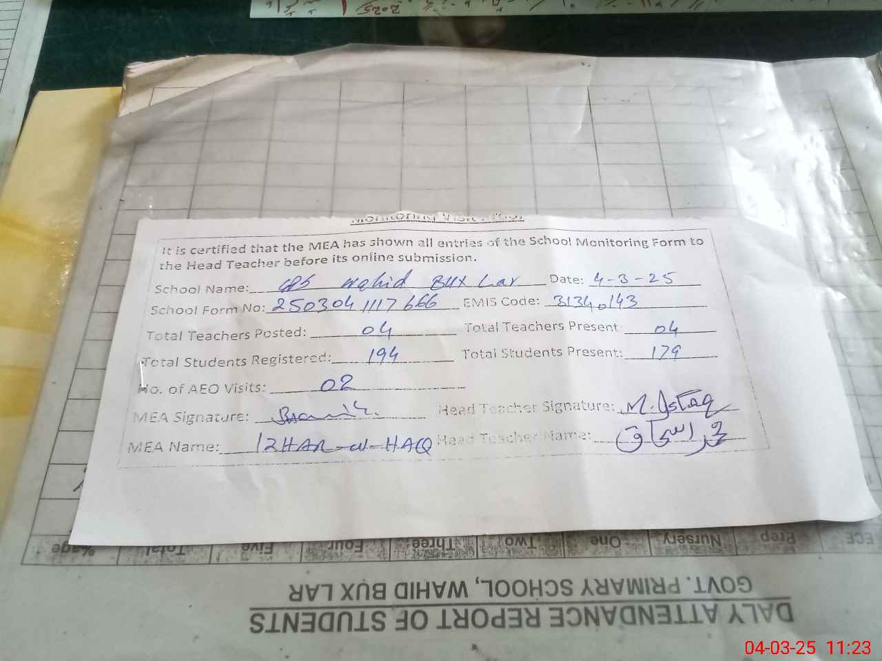 | Attendance Register | Head Teacher | MEA with School | Visit Proof |