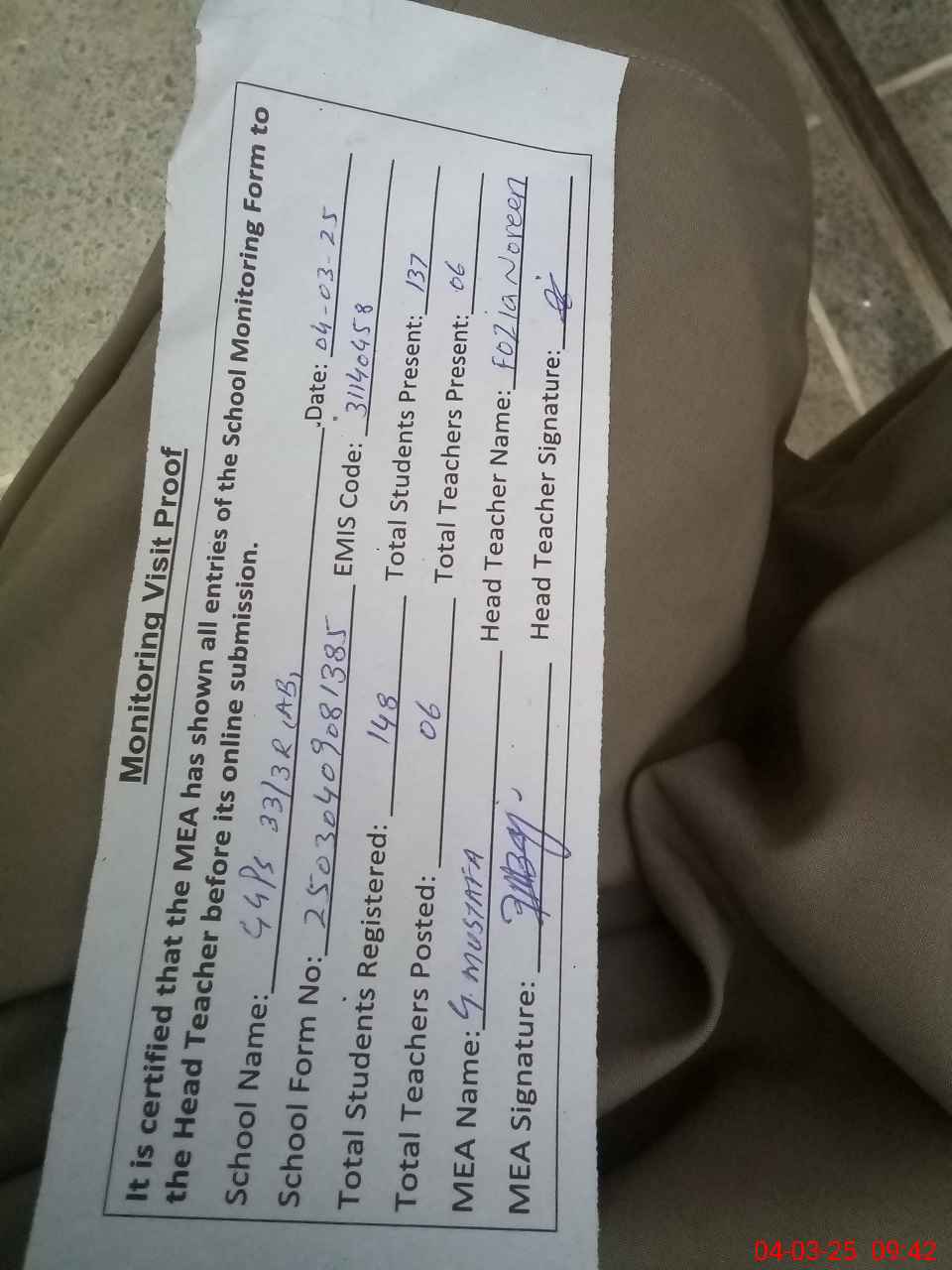 | Attendance Register | Head Teacher | MEA with School | Visit Proof |