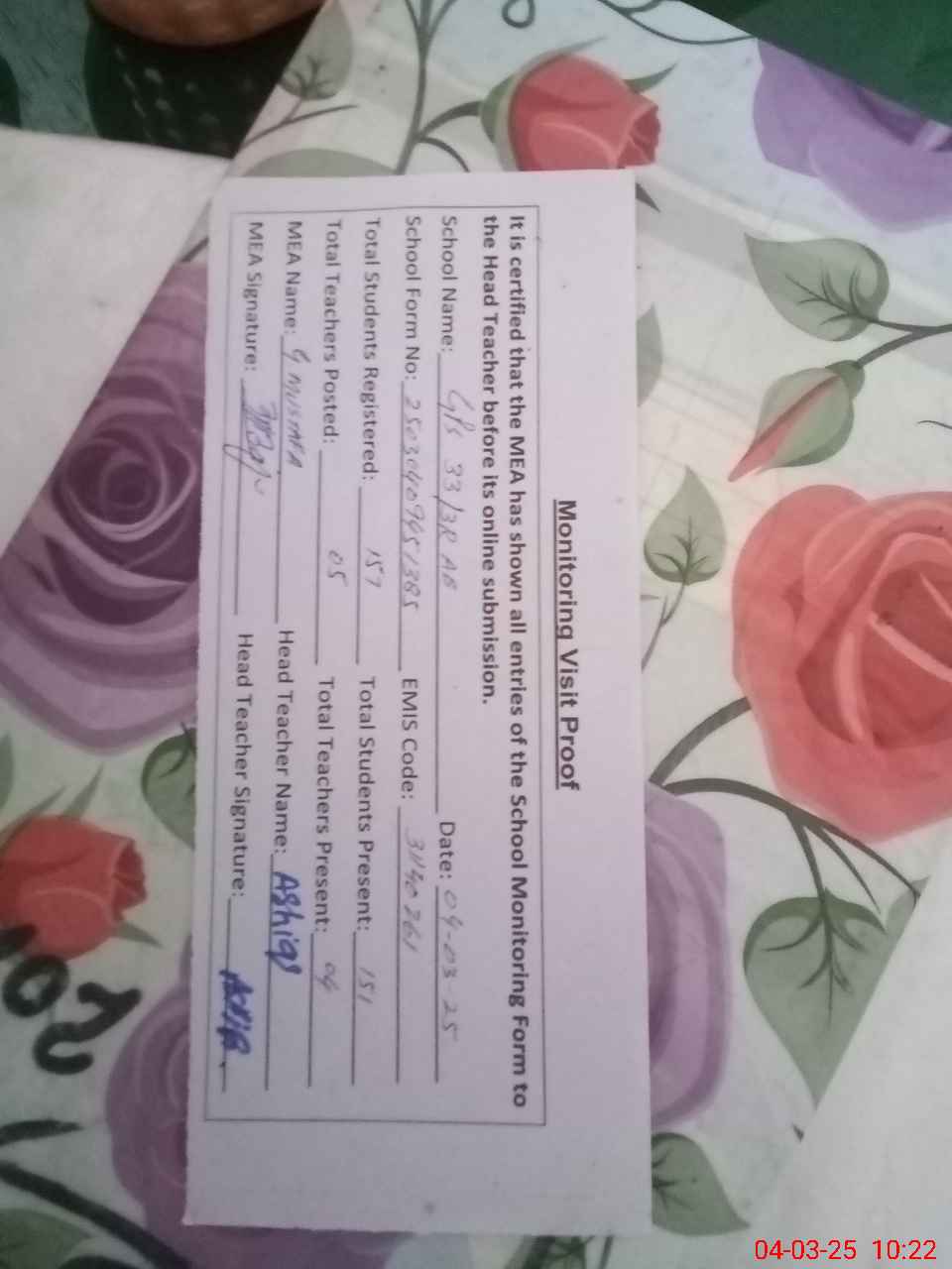 | Attendance Register | Head Teacher | MEA with School | Visit Proof |