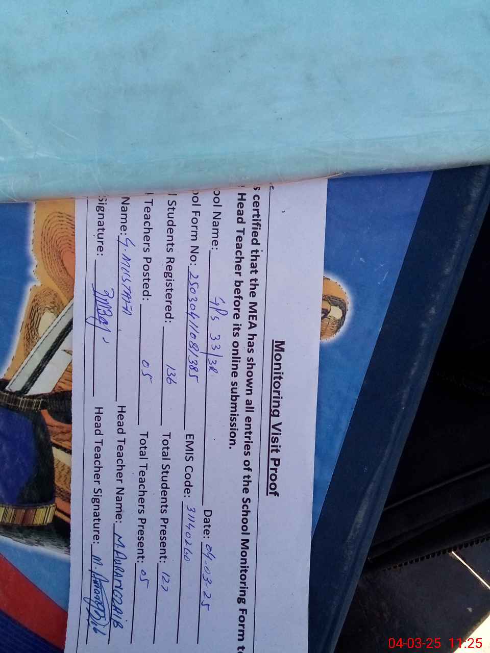 | Attendance Register | Head Teacher | MEA with School | Visit Proof |