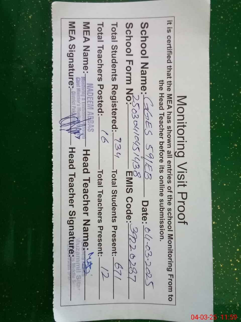 | Attendance Register | Head Teacher | MEA with School | Visit Proof |