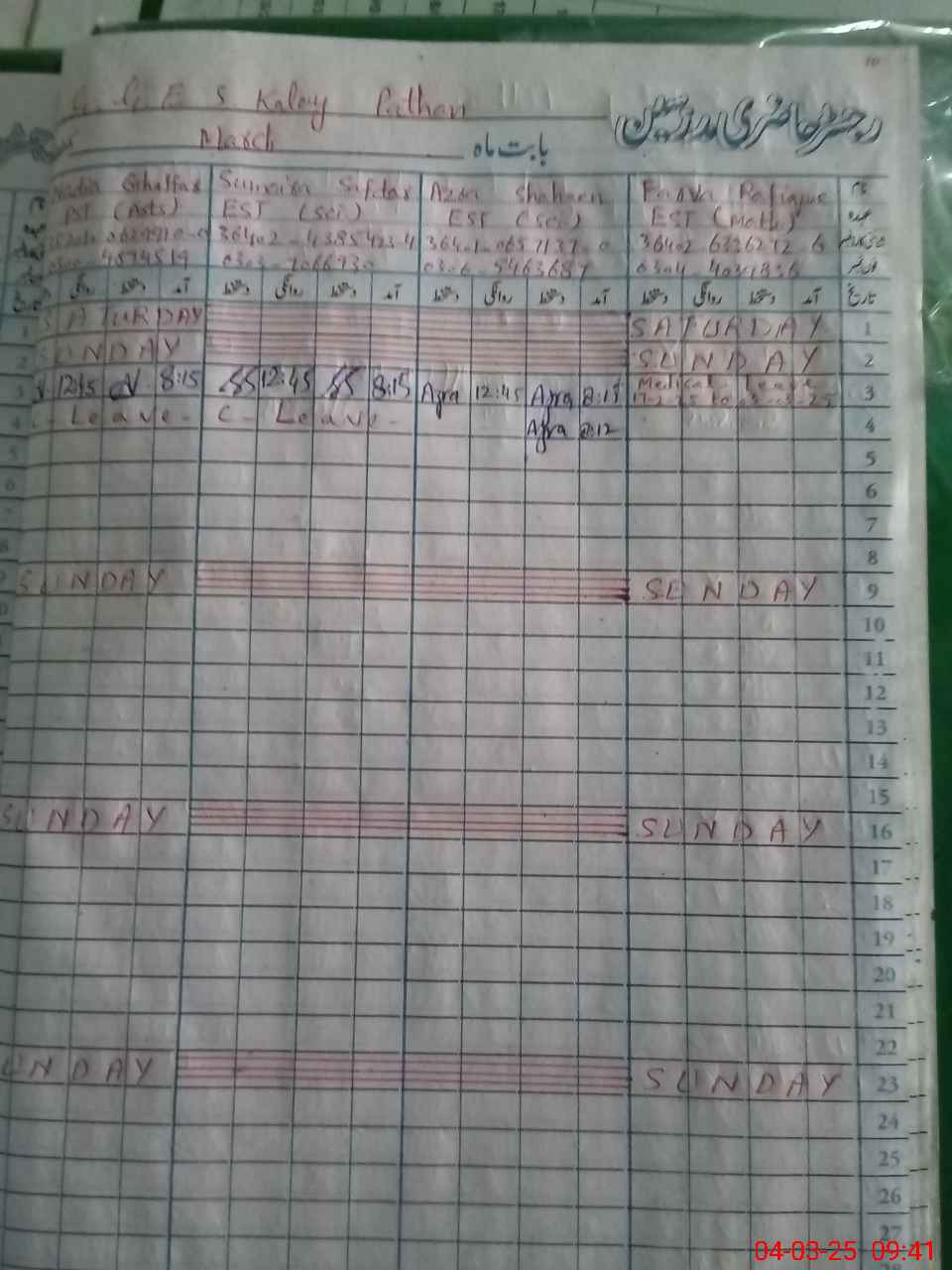 | 36**** | Fa**** Ra**** | Regular | 13 | 0 | 0 | 0 | 12 | 0 | 0 | 0 | 1 | Exam Duty | |