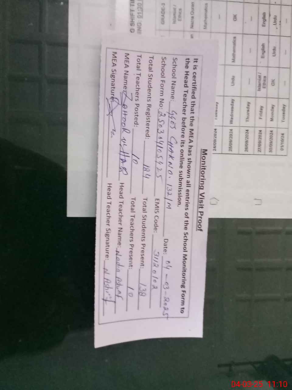 | Attendance Register | Head Teacher | MEA with School | Visit Proof |