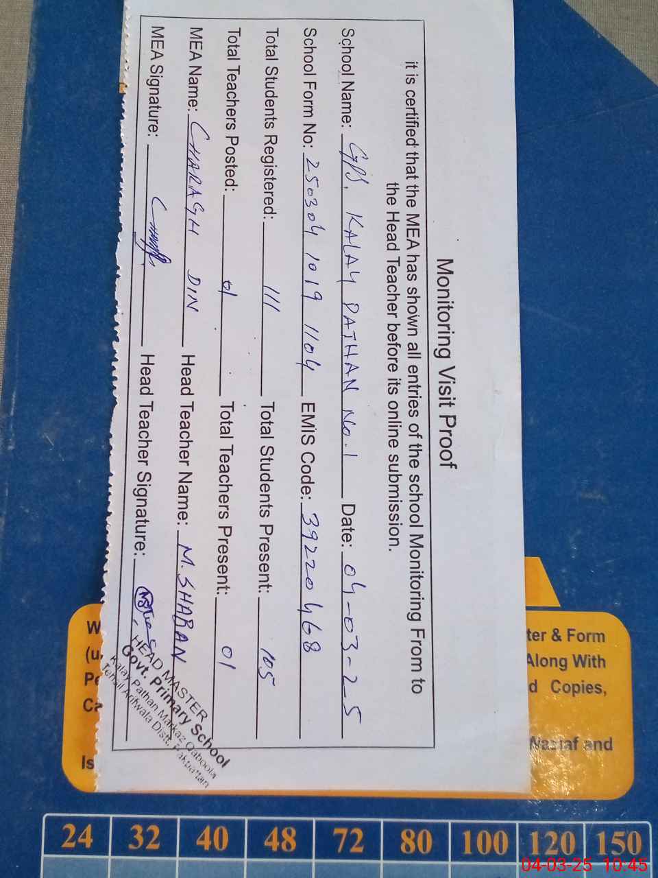 | EMIS Code: 39220468 | Name of School: GPS KALAY PATHAN NO 1 | |||