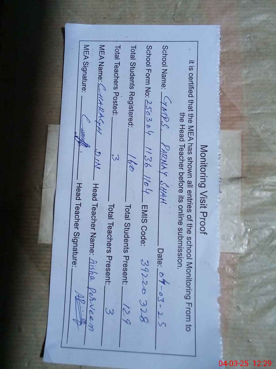 | Attendance Register | Head Teacher | MEA with School | Visit Proof |