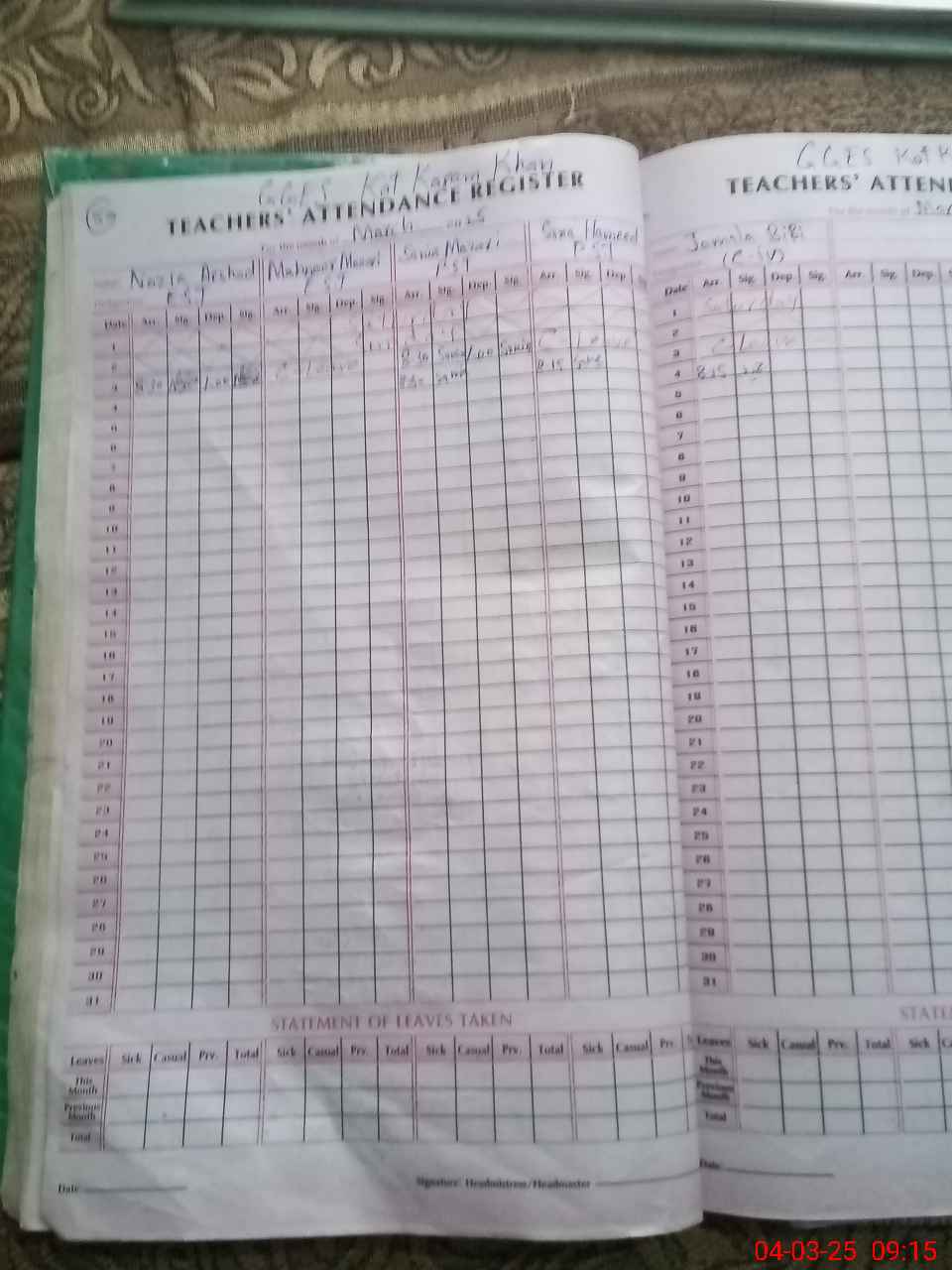 | Remarks (Use Separate Page if Required): NSB record not provided FTF record not provided FTB record not provided Mahnoor mazari EST and Nazia Arshad EST both teachers are unauthorized absent Time table not displayed in the class rooms | |||||