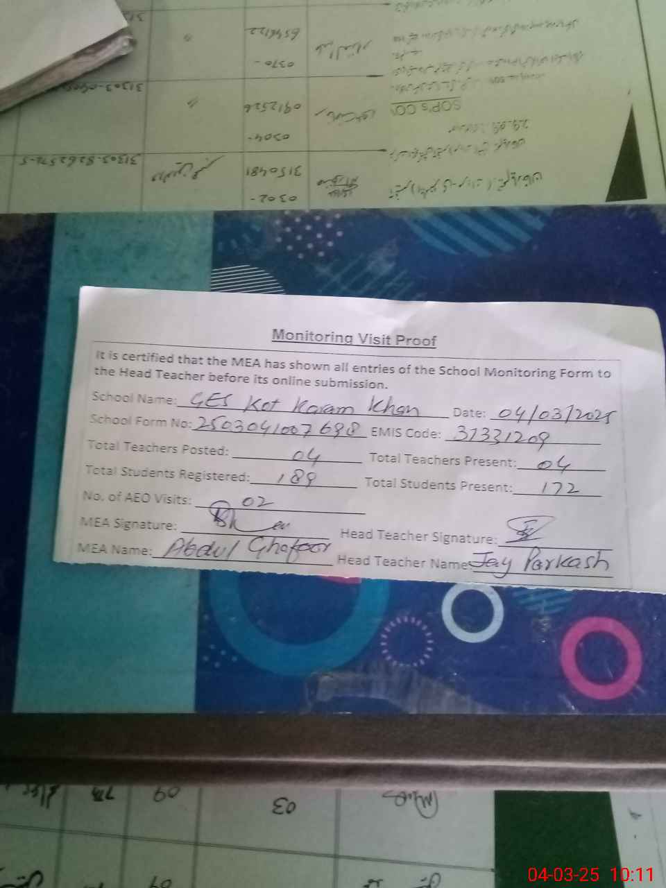 | Attendance Register | Head Teacher | MEA with School | Visit Proof |