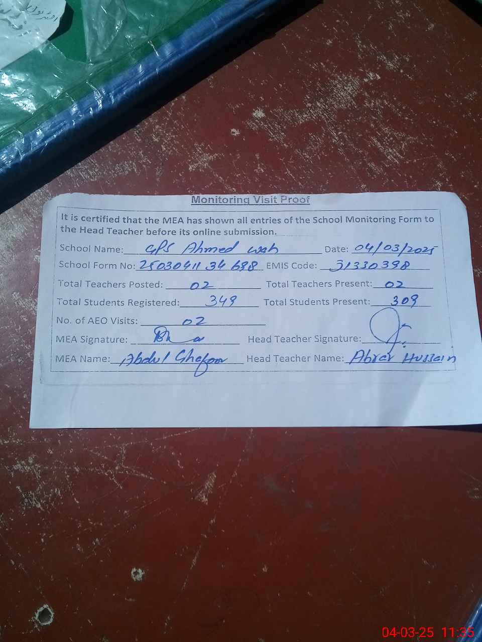 | EMIS Code: 31330398 | Name of School: GPS AHMED WAH | |||