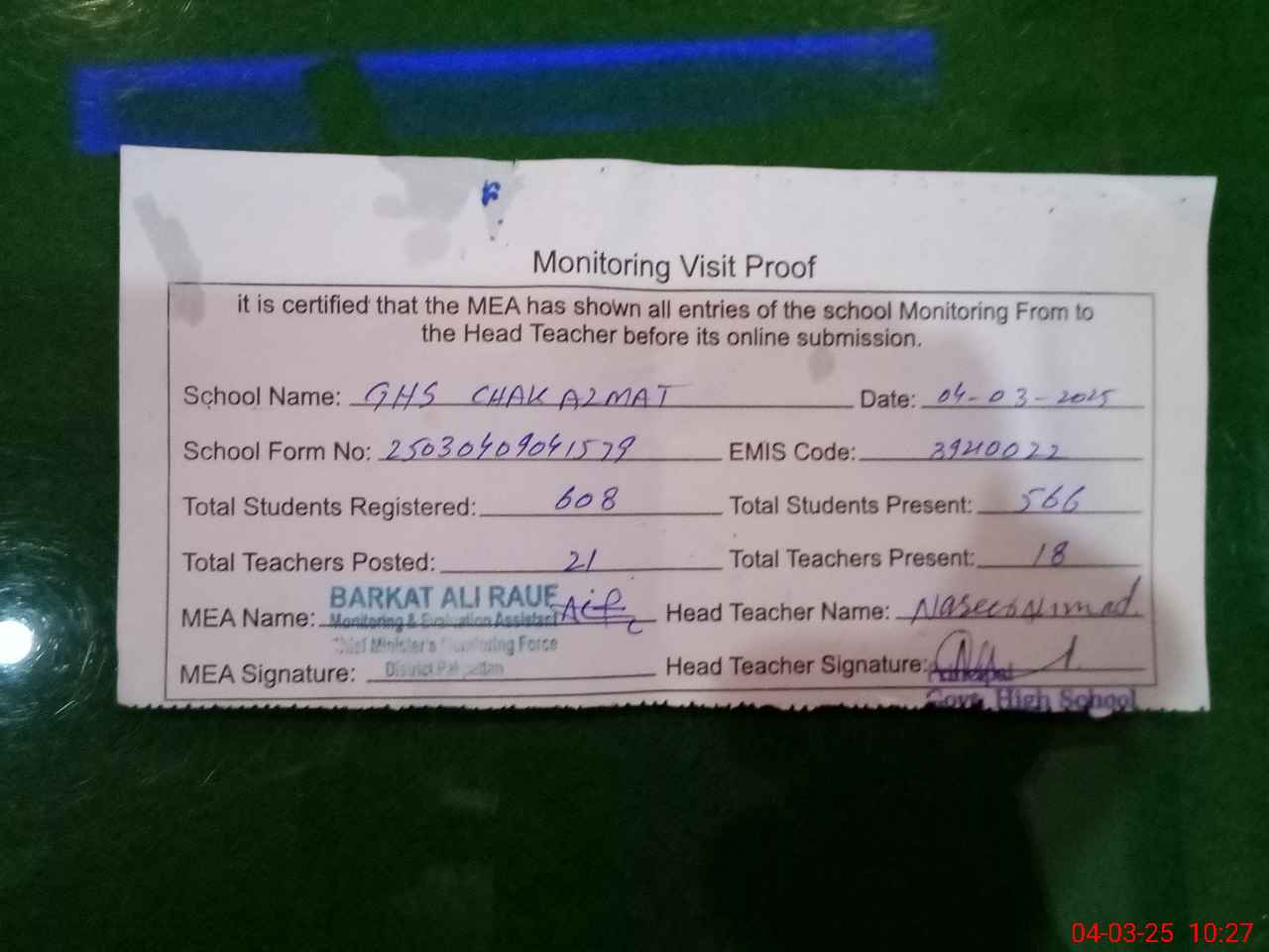 | EMIS Code: 39210022 | Name of School: GHS CHAK AZMAT | |||
