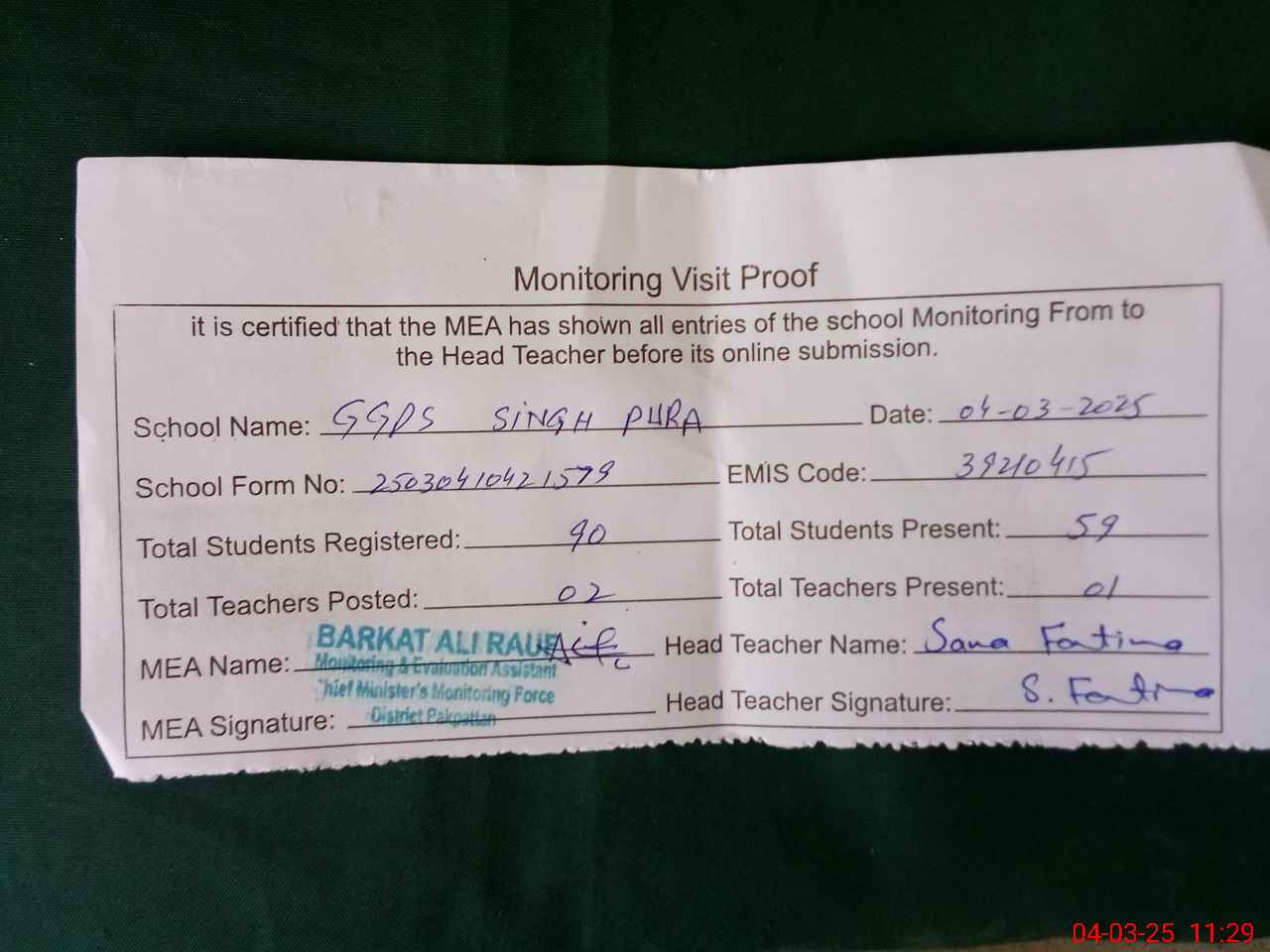 | EMIS Code: 39210415 | Name of School: GGPS SINGH PURA | |||