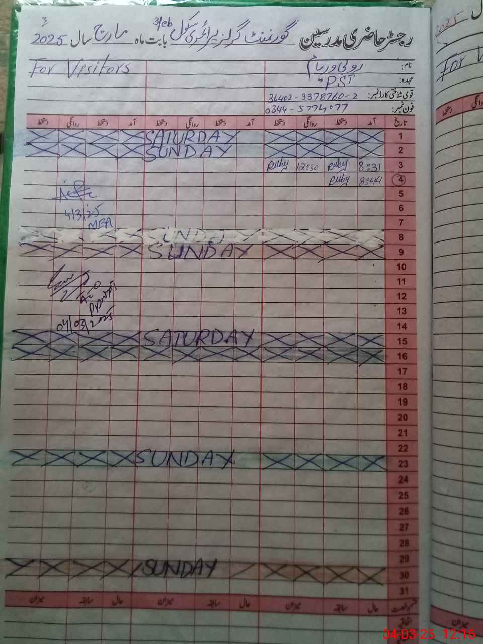 | Name: RU**** WA**** Designation: (School Headmaster's/Headmistress's) PST Phone/Cell Number: 03**** |
