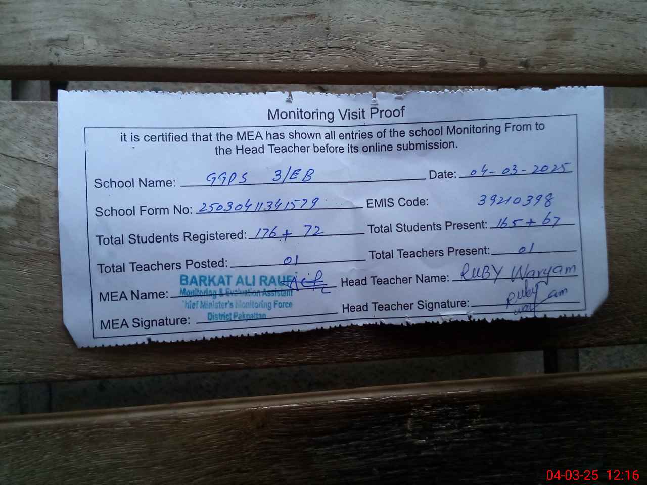 | Attendance Register | Head Teacher | MEA with School | Visit Proof |