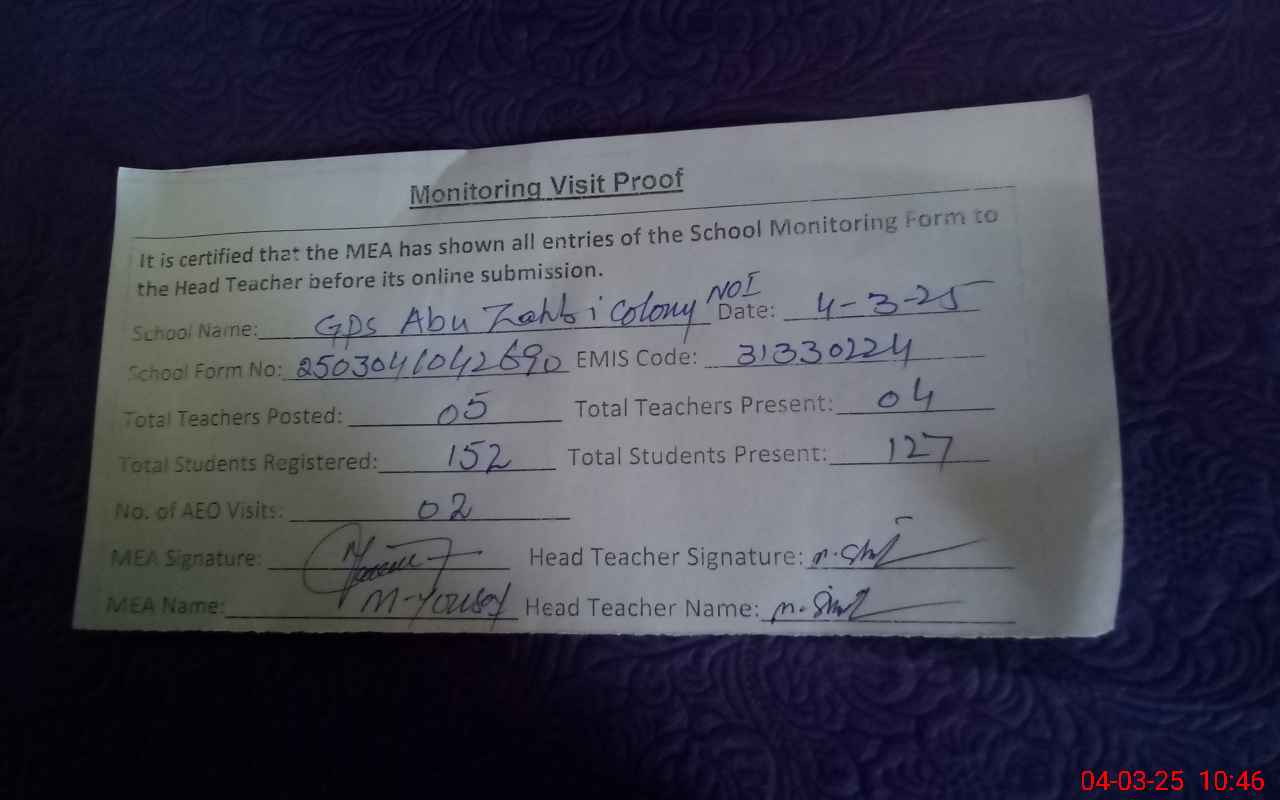 | EMIS Code: 31330224 | Name of School: GPS ABU ZAHBI COLONY NO. 1 | |||