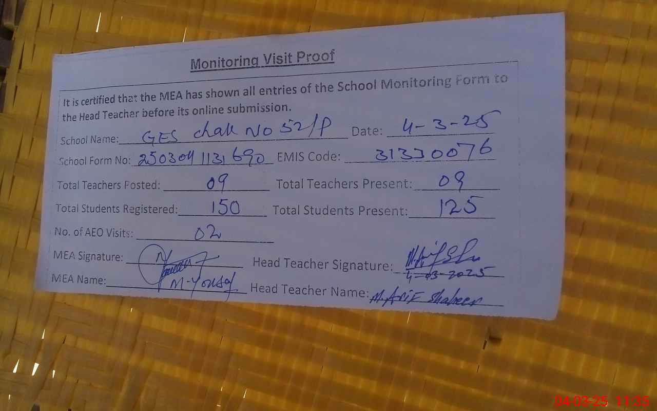 | EMIS Code: 31330076 | Name of School: GES CHAK 52/P | |||
