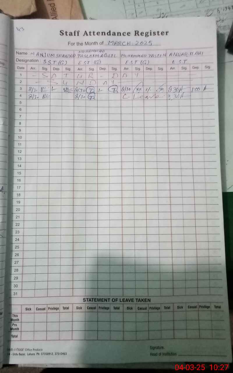 | Name: M.**** Sh**** Designation: (School Headmaster's/Headmistress's) S.S.T.gen Phone/Cell Number: 03**** |