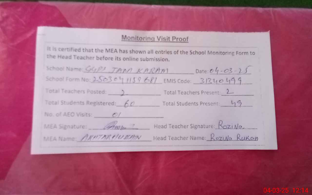 | EMIS Code: 31340499 | Name of School: GGPS JAM KARAM | |||