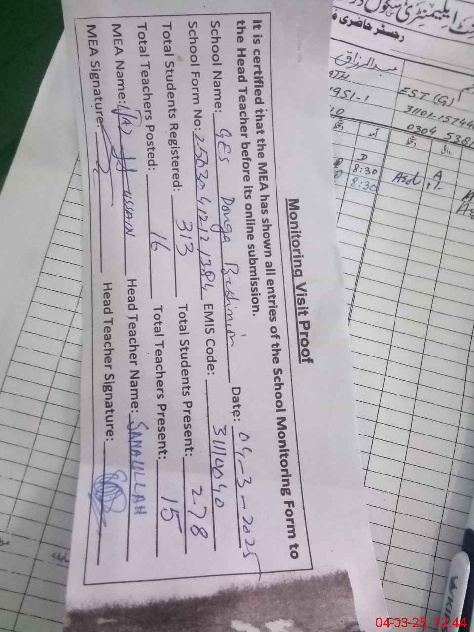 | Attendance Register | Head Teacher | MEA with School | Visit Proof |