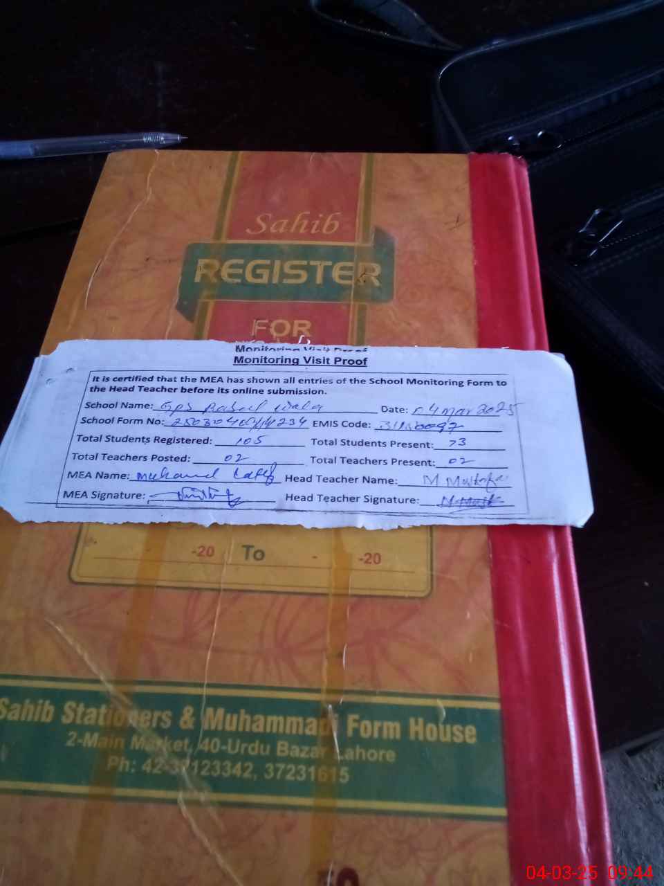 | Attendance Register | Head Teacher | MEA with School | Visit Proof |