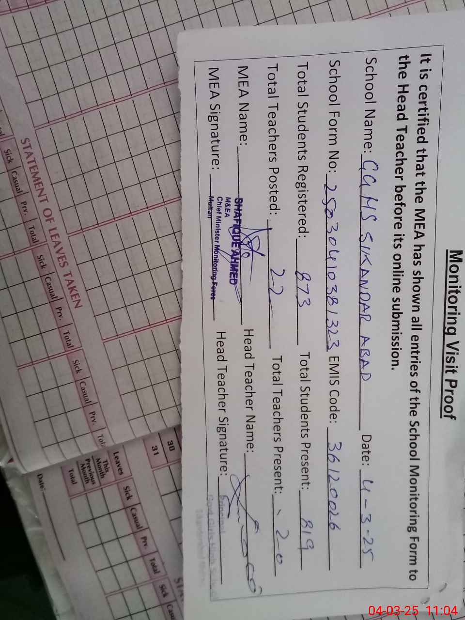 | Attendance Register | Head Teacher | MEA with School | Visit Proof |