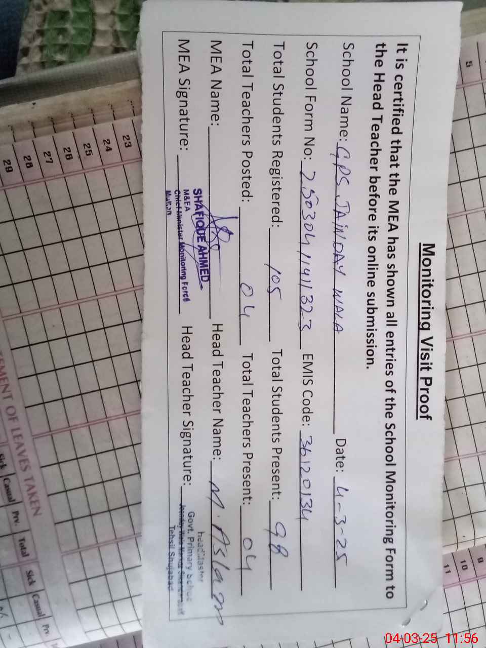| Attendance Register | Head Teacher | MEA with School | Visit Proof |