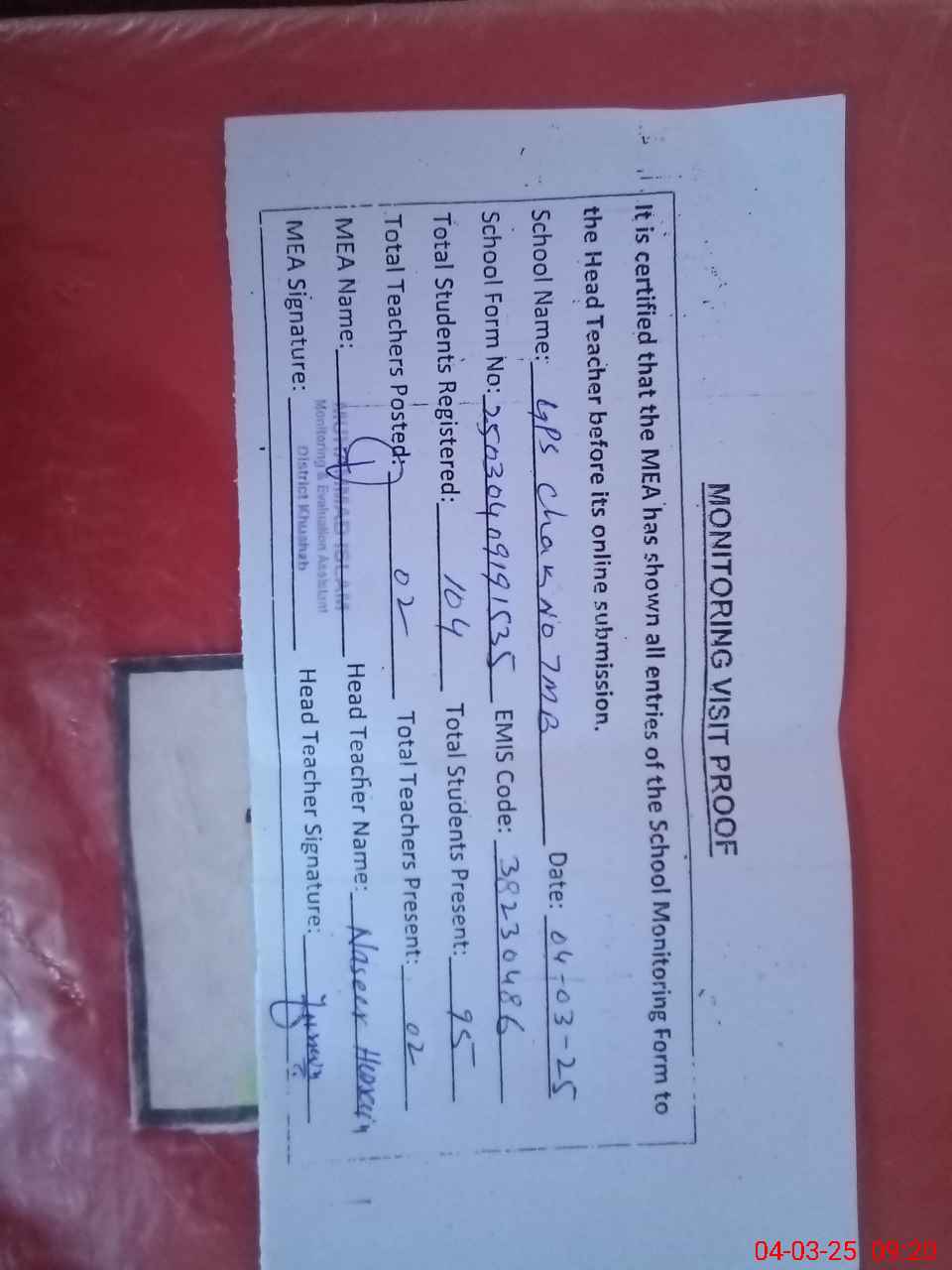 | Attendance Register | Head Teacher | MEA with School | Visit Proof |