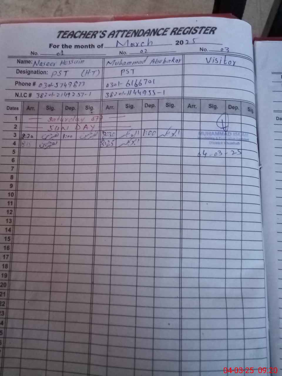 | CNIC | Full Name | Designation | R/C | Absence During Last Calender Month |