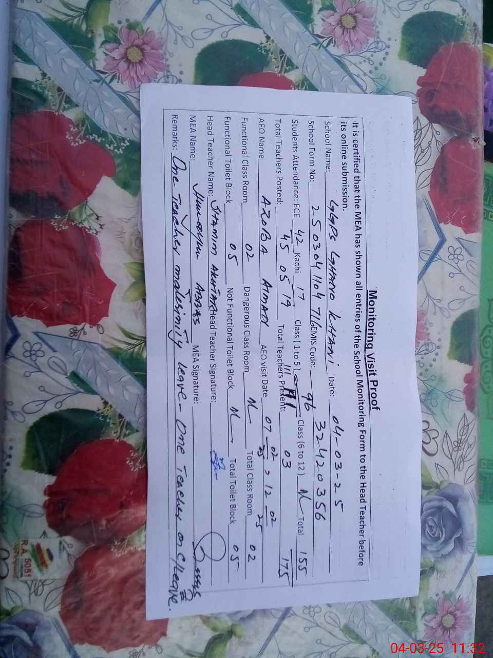 | Remarks (Use Separate Page if Required): One teacher on maternity leave One teacher on casual leave over All cleaness good | |||||