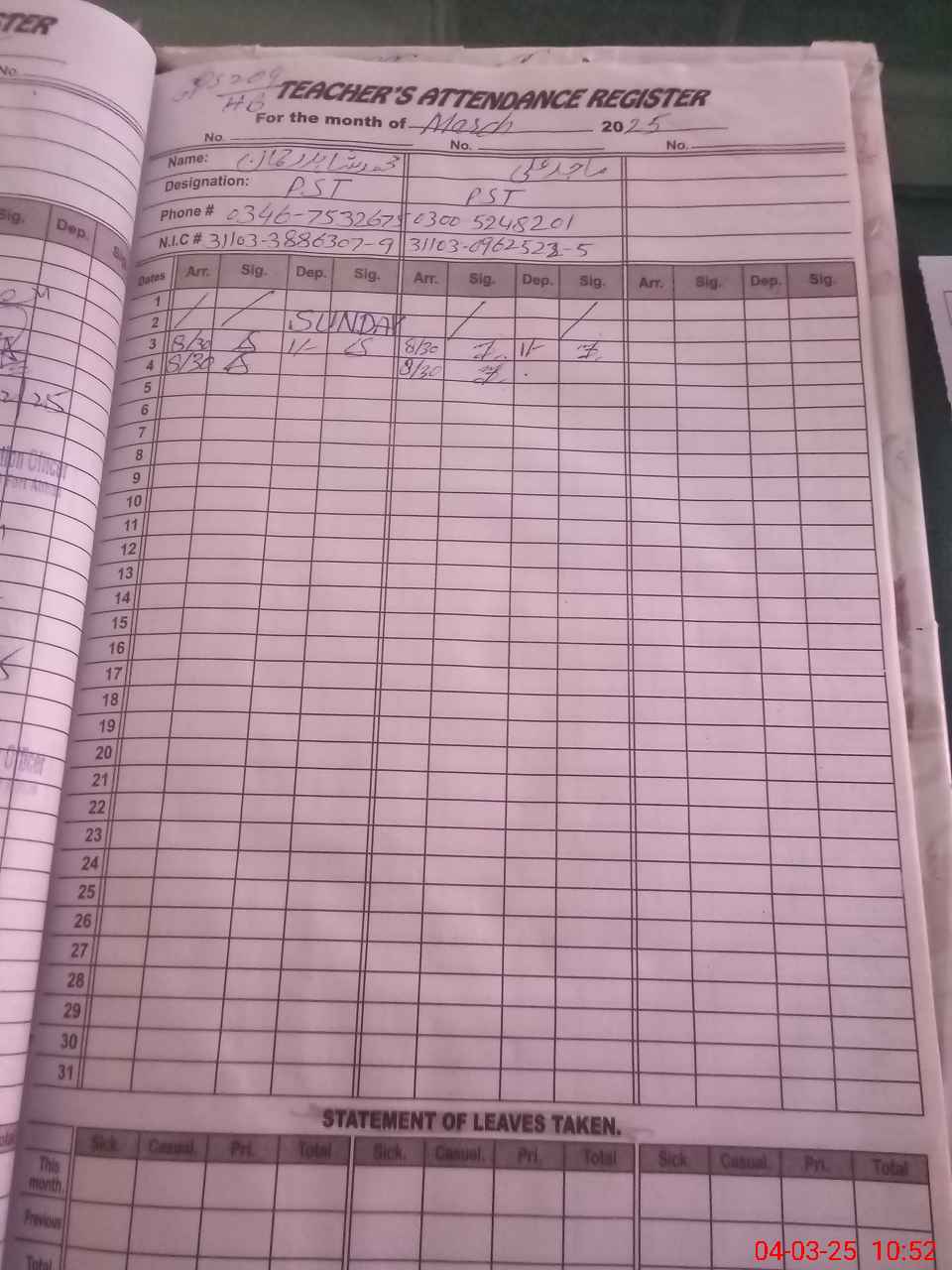 | CNIC | Full Name | Designation | R/C | Absence During Last Calender Month |